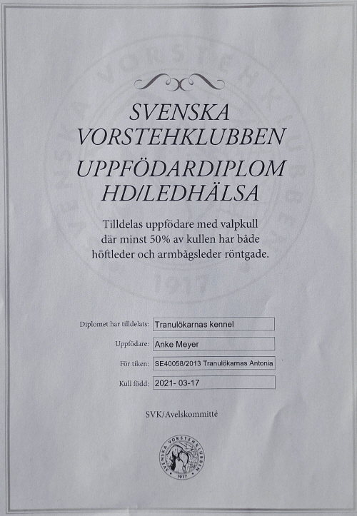 Antonia användas nästan dagligen på jakt och vi är mycket nöjda med den här allsidigt jagande hunden. Hon har fantastiskt skall. Utöver dokumenterat siktskall på VJP (hon har ofta spårskall under jakt) kunde hon under momentet "Stöbern", där hon var i sitt esse, på VPS få skallintyg för "Lautes Stöbern" (stöta med skall) på klövvilt.