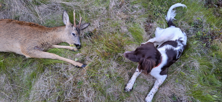 2. En rådyrbukk som ble påskutt løp inn i sv rt tett ris og busker. Da er det kjekt å ha en hund som kan gjøre ettersøk. Null problem for Calluna.