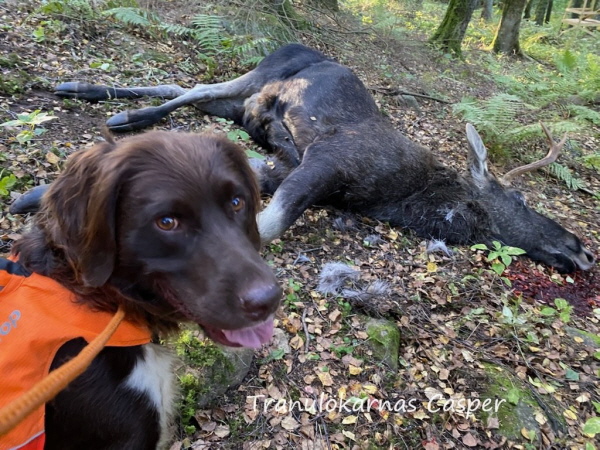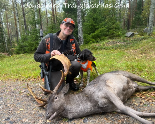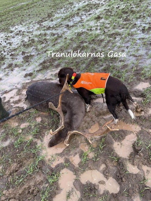 "Vi har jagat kontinuerligt sedan jaktsäsongen kom igång. Gaisi jobbar jättebra med fint sök, härligt skall och inhärdigt arbete. Har varit lite stolpe ut med flera fina drev på kronhjort, dovhjort och rådjur men inget skottläge. Idag däremot hade han fint drev både på älgkalv och rådjur som blev kvar på platsen. Jättekul. Har en trött och nöjd hund här hemma nu."