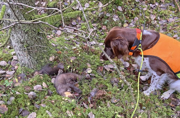 "I går släpptes Gunvald på vår lilla mark men han lyckades få upp minst 6 rådjur, 2 harar, 1 dovhjort 1 morkulla och 1 vildsvin. Alina stod för ett vildsvin som hon o Gunvald fick göra ett kortare eftersök på. Det var väldigt trevligt att se att Gunvald har bra respekt för vildsvin och visar var dom är utan att gå i fight med dom. Ska bli kul nästa helg för att se om vi kan skjuta något på vår andra mark. Vi nollade förra gången då Gunvald inte var med. Gången innan var han med och vi sköt 1 rådjur, 1 vildsvin och 3 dovhjortar."