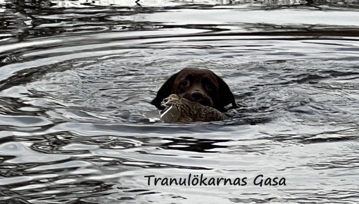 "Hej Anke! Här kommer en rapport för säsongen sista jaktdag. Jag släppte Gasa i en liten minde skogsparti. Hon drar iväg direkt och drar några väckskall. Kommer tillbaka till mig och drar direkt igen. Då får hon fart på ett gäng dov. Hon spränger gruppen och drar iväg men en kapital dovtjur som en pass skytt lyckas fälla. Hon kommer tillbaka till mig och drar direkt igen. Hon söker upp en del av gruppen hon sprängt och jagar 6 hjortar. Dessvärre kommer dom i förbjuden skjutriktning för en pass skytt. Men hon håller i och jagar dom i cirka fem minuter med skall innan hon släpper och kommer tillbaka till mig. Gasa drar iväg ytterligare en sväng och tar sällskap av en annan hund och sätter fart på två vildsvin. Dessvärre drar svinen bakåt i såten så ingen lyckas skjuta dom heller.