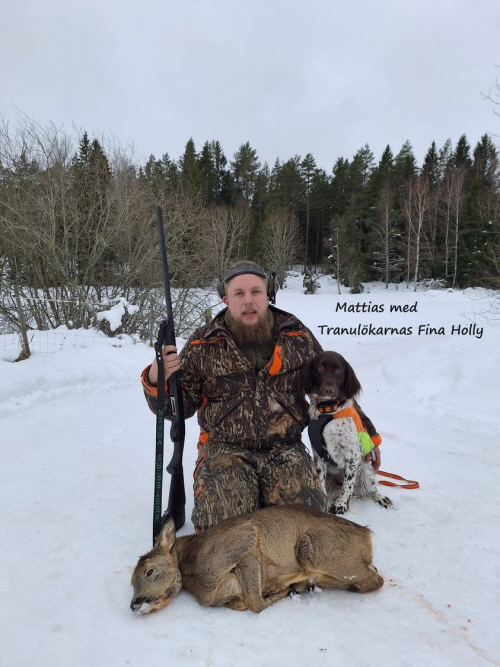 "Vi hade gått av holmarna och började bege oss hemåt och plötsligt försvinner Holly bort och efter typ 40 sek hör vi ett intensivt skall och plötsligt ett rådjur som skrek, jag och Daisy la benen på ryggen och tog oss dit ca 200 m. När vi kom fram hade Holly rivit ner ett kid och höll ner det till vi kom fram så jag kunde avsluta. Jag var glad för Holly men hade lite dåligt samvete att hon fått tag i ett levande vilt själv men allt det ändrade sig när jag öppnade upp den, då kunde vi konstatera att den inte var helt frisk och därmed så kunde det inte gått bättre än va det gjorde."
