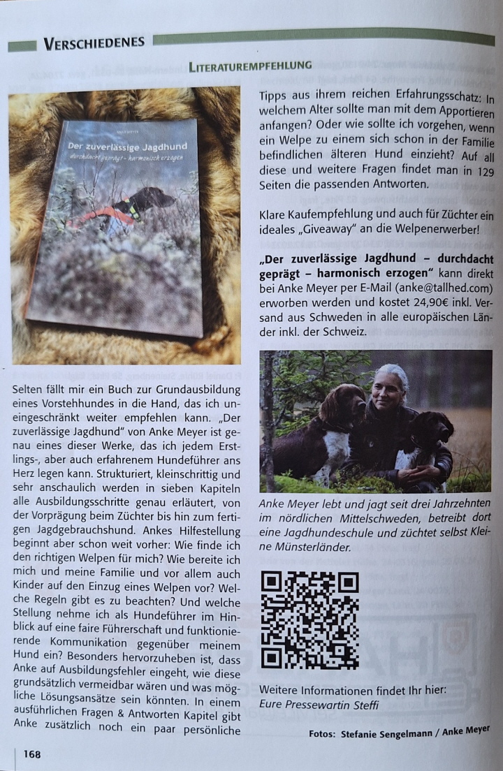 "Jag stöter sällan på en bok om grundträning av en stående jakthund, som jag helt och hållet kan rekommendera. "Der zuverlässige Jagdhund" av Anke Meyer är exakt ett av de där verken som jag rekommenderar till alla förstagångs-jakthundsägare, men även till erfarna hundförare kan jag rekommendera boken. Strukturerad, steg-för-steg och mycket tydlig förklaras i sju kapitel alla träningssteg i detalj, från prägling hos uppfödaren till färdig jakthund. Men det börjar långt innan dess: Hur hittar jag rätta valpen för mig? Hur förbereder jag mig, min familj och framförallt hur förbereder jag mina barn för valpens ankomst? Vad finns för regler att följa? Och vilken ställning tar jag som hundförare vad gäller rättvist ledarskap och kommunikation med min hund? Det är särskilt anmärkningsvärt att Anke diskuterar träningsfel, som skulle kunna undvikas och vad som skulle kunna vara möjliga lösningar. I en detaljerade frågor och svar kapitel har Anke även några personliga tips från hennes rika erfarenhet: I vilken ålder bör man börja apportträningen? Eller hur ska jag göra om en valp flyttar in till en äldre hund? På alla dessa och andra frågor finns i 129 sidor svar. En tydlig köp-rekommendation och även för uppfödare en perfekt "giveaway" till sina valpköpare!"