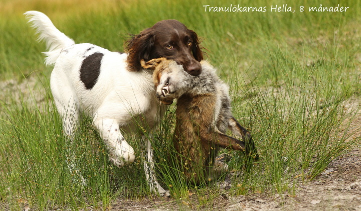 Hella: ”Livet som jakthund alltså… Matte är ibland helt galen. Hon skickade mig idag för att apportera en räv. Mamma Gjende hade gjort först och matte hade kanske glömt att vi inte än har tränat tunga grejer. Det tyngsta jag burit i mitt liv var en tjock and. Jag visste faktiskt inte att en räv är tung och sprang glad dit, tog rävjäveln och ville glad kasta den i luften eftersom jag var superexalterad att även jag fick ta hand (eller hellre tassa) om den. Då märkte jag att den var jättetung och ja, jag vet: jag skulle inte leka med den, jag skulle ju jobba. I alla fall kände jag, som egentligen är redan ganska stark, att jag inte var tillräckligt stark för att apportera räven. Då kom jag på ett knep och som ni ser har jag apporterat min första äkta, tunga räv ändå. Mitt livsmotto är: Ta alla utmaningar och bara kämpa på!”