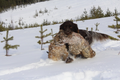 Att apportera räven är ännu tungre i djup snö. Ändå inget problem för en vältränat Kleinen Münsterländer.