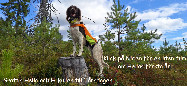 Hej, jag (Hella) måste berätta något för er. Ikväll var jag på jakt med matte och mamma Gjende för tredje gången i mitt liv och då hände det. Jag var supercool och tyst före skottet och lika cool efteråt. Eftersom bocken sprang en bit iväg skickade matte min mamma efter bocken och jag fick visa för matte vart de tog vägen. Det var inte långt bort. Mamma Gjende hade snabbt gjort slut med bocken och visade stolt bytet för oss. Vi var alltså inblandade alla tre och jag var mycket stolt att kunna hjälpa till. Jag är med mina sju månader fortfarande ganska liten, men matte sade att jag var superduktig och fint tyst idag. Vilken kväll. Nu vet jag varför vi sitter eller hellre ligger i skogen på kvällen och vänter och vänter. Jakt är spännande, jag är glad att jag är en jakthund och ser mycket fram emot alla jakter i mitt liv.