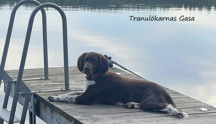 "Hej Anke! Här kommer en rapport för säsongen sista jaktdag. Jag släppte Gasa i en liten minde skogsparti. Hon drar iväg direkt och drar några väckskall. Kommer tillbaka till mig och drar direkt igen. Då får hon fart på ett gäng dov. Hon spränger gruppen och drar iväg men en kapital dovtjur som en pass skytt lyckas fälla. Hon kommer tillbaka till mig och drar direkt igen. Hon söker upp en del av gruppen hon sprängt och jagar 6 hjortar. Dessvärre kommer dom i förbjuden skjutriktning för en pass skytt. Men hon håller i och jagar dom i cirka fem minuter med skall innan hon släpper och kommer tillbaka till mig. Gasa drar iväg ytterligare en sväng och tar sällskap av en annan hund och sätter fart på två vildsvin. Dessvärre drar svinen bakåt i såten så ingen lyckas skjuta dom heller.