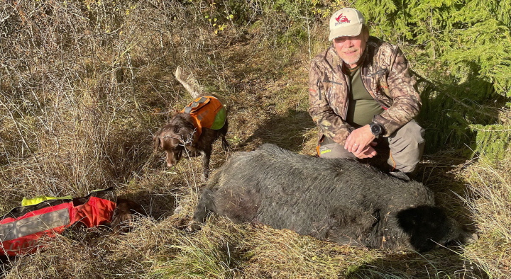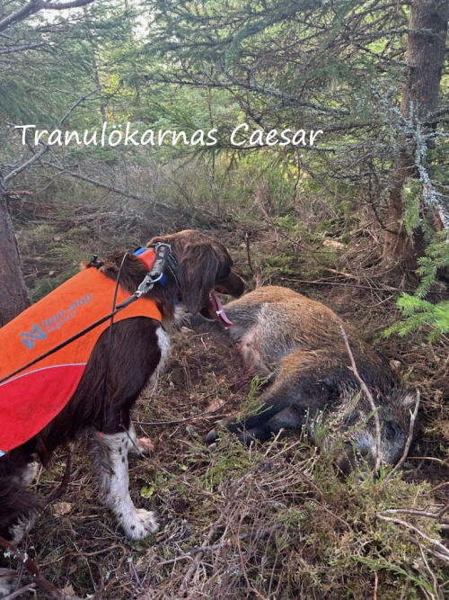 Tranulökarnas Caesar förra veckan suveränt på fågeljakt, den här veckan på vildsvinsjakt: